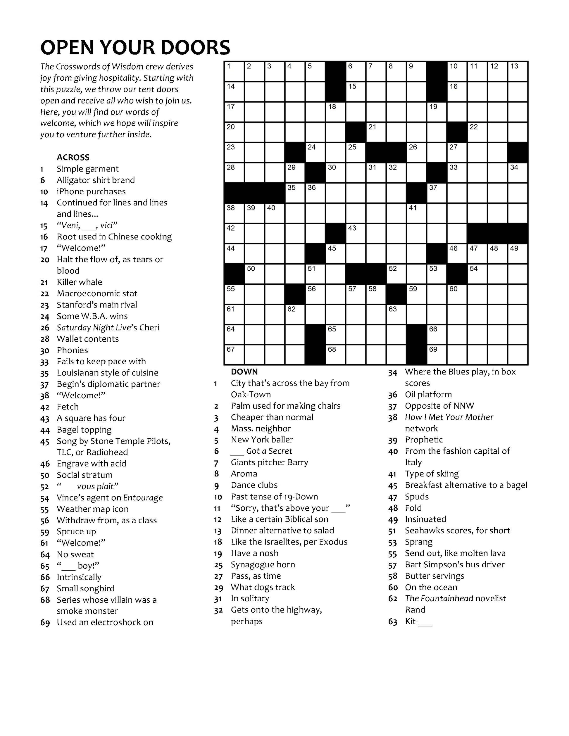 Crosswords of Wisdom Volume 1 contains 50 crossword puzzles that are about living your life in the best possible manner. Covering a wide range from subjects—from charity to comforting loved ones, from learning to play instruments to speaking out against oppression—these crosswords always have a purpose. Based on a series of puzzles appearing on the ten-foot-tall crossword wall in the Eltana bagel restaurant in Seattle, Washington.