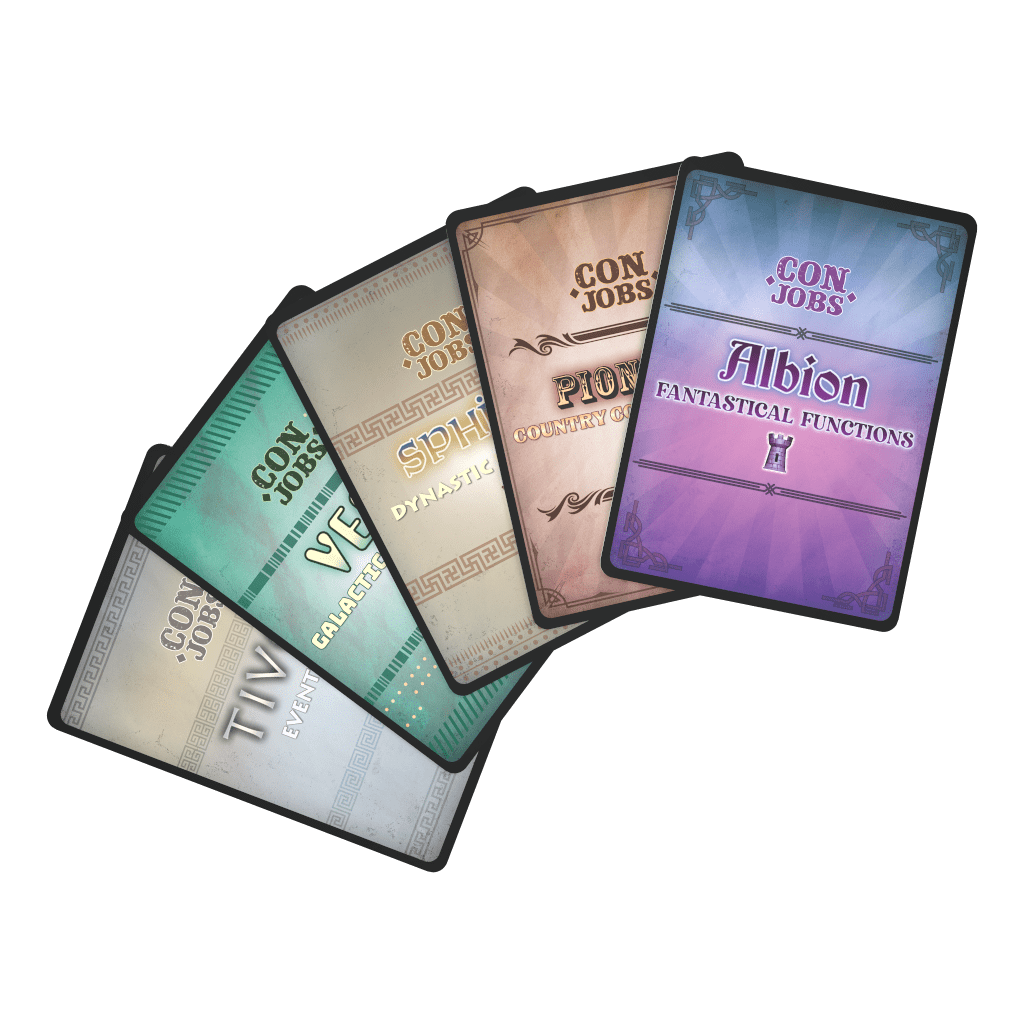 The Lords of Vegas™ mini-expansion Con Jobs is a 55-card deck that plays with every edition and expansion of Lords of Vegas. Con Jobs features a host of conventions and events coming to your gambling paradise, changing the game on every turn. Depending on which kind of casino you focus on during your turn, you can host any event from a Route 66 Rally to a Petroleum Industry Summit‚ even the office favorite Clown College Reunion!
