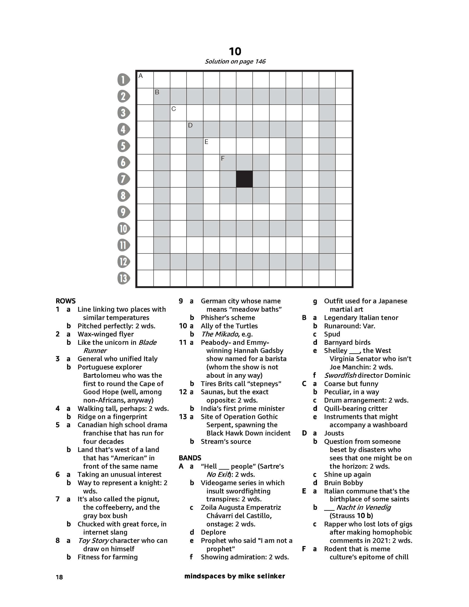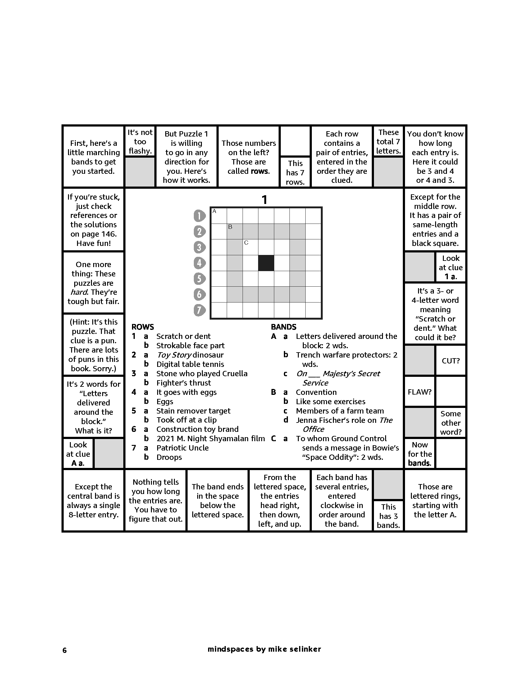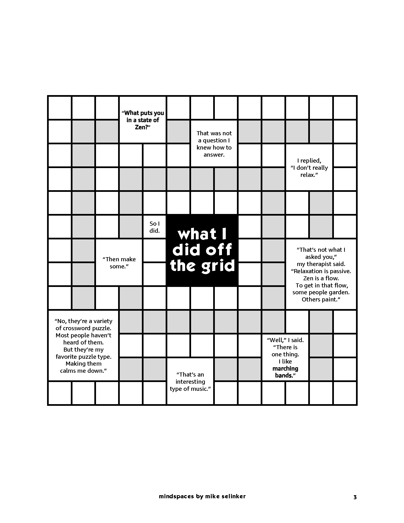 Mindspaces is a unique puzzle book focused on the fusion of art and mental health. It contains 111 marching bands crossword variants that the author created as a therapeutic exercise, along with essays on how to be creative even when your mind is telling you that you can’t. These clever, intricate, and fun puzzles draw from all types of knowledge, giving you many days of enjoyment and contemplation.