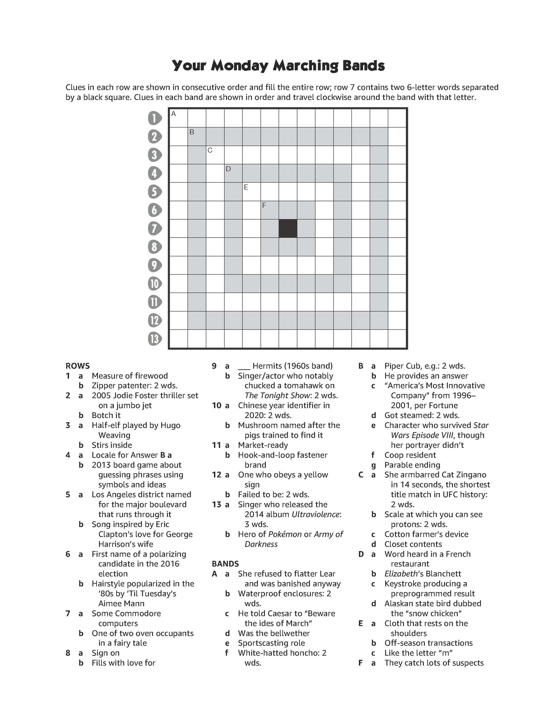 Puzzlepack #2: Marching Bands is the second PDF booklet in Lone Shark’s new series of puzzlepacks. These crossword variants march words around a grid clockwise, crossing words going across. In honor of Marching Bands creator Mike Shenk, Mike Selinker has designed a week of seven of these hot little numbers for puzzle fans everywhere.