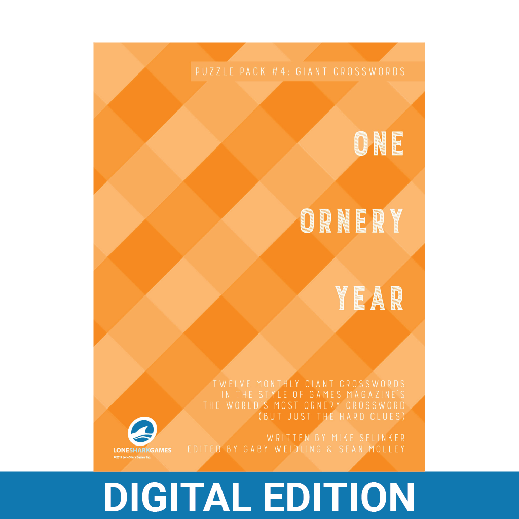 Puzzlepack #4: Giant Crosswords is the fourth PDF booklet in Lone Shark’s series of puzzlepacks. This collection, subtitled One Ornery Year, consists of 12 giant 25x25 themeless crossword puzzles, inspired by the World’s Most Ornery Crossword from Games magazine. But we’re just providing the hard clues this time!