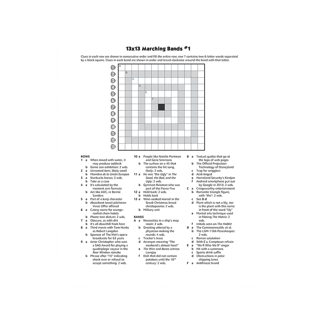 Puzzlepack #7: Marching Bands is the seventh PDF booklet in Lone Shark’s series of puzzlepacks. These crossword variants march words around a grid clockwise, crossing words going across. In honor of Marching Bands creator Mike Shenk, Mike Selinker has designed ten of these head-turning grids for puzzle fans everywhere. There are six regular-sized 13x13s puzzles, three 15x15 Mega-Marching Bands, and a stunning 17x17 Giga-Marching Bands.
